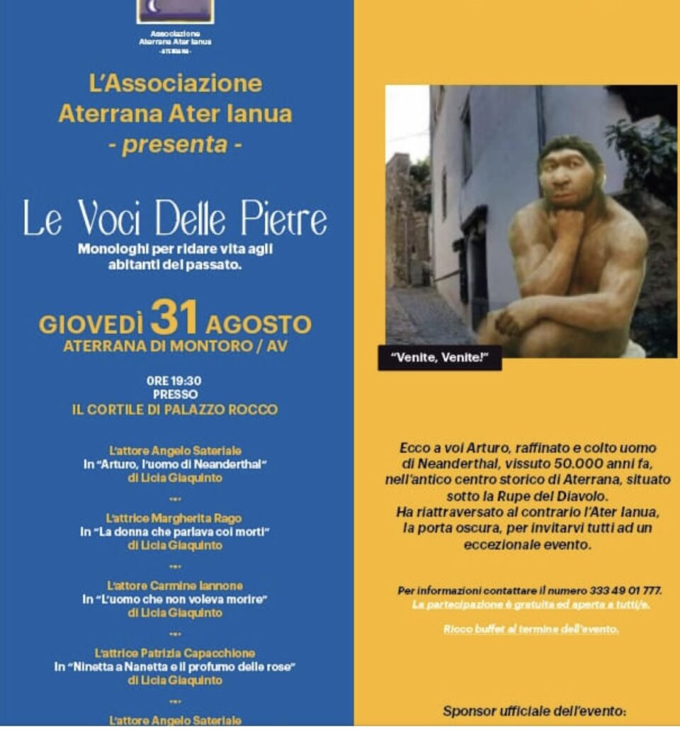 Domani alle 19.30 presso il Cortile Rocco ad Aterrana di Montoro torna “Le voci delle pietre”, la manifestazione che anima il piccolo borgo magico con arte, spettacoli e cultura. La scrittrice Licia Giaquinto questa volta metterà in scena cinque suoi monologhi che ridaranno vita agli antichi abitanti del paese, impersonati dagli attori Carmine Iannone, Margherita Rago, Angelo Sateriale e Patrizia Capacchione, con l’accompagnamento musicale del maestro Gianni Molinaro. Il tutto sotto lo sguardo attento di Arturo, l’uomo di Neanderthal che ha attraversato al contrario l’Ater Ianua, la porta scura, per invitarvi tutti a questo eccezionale evento.