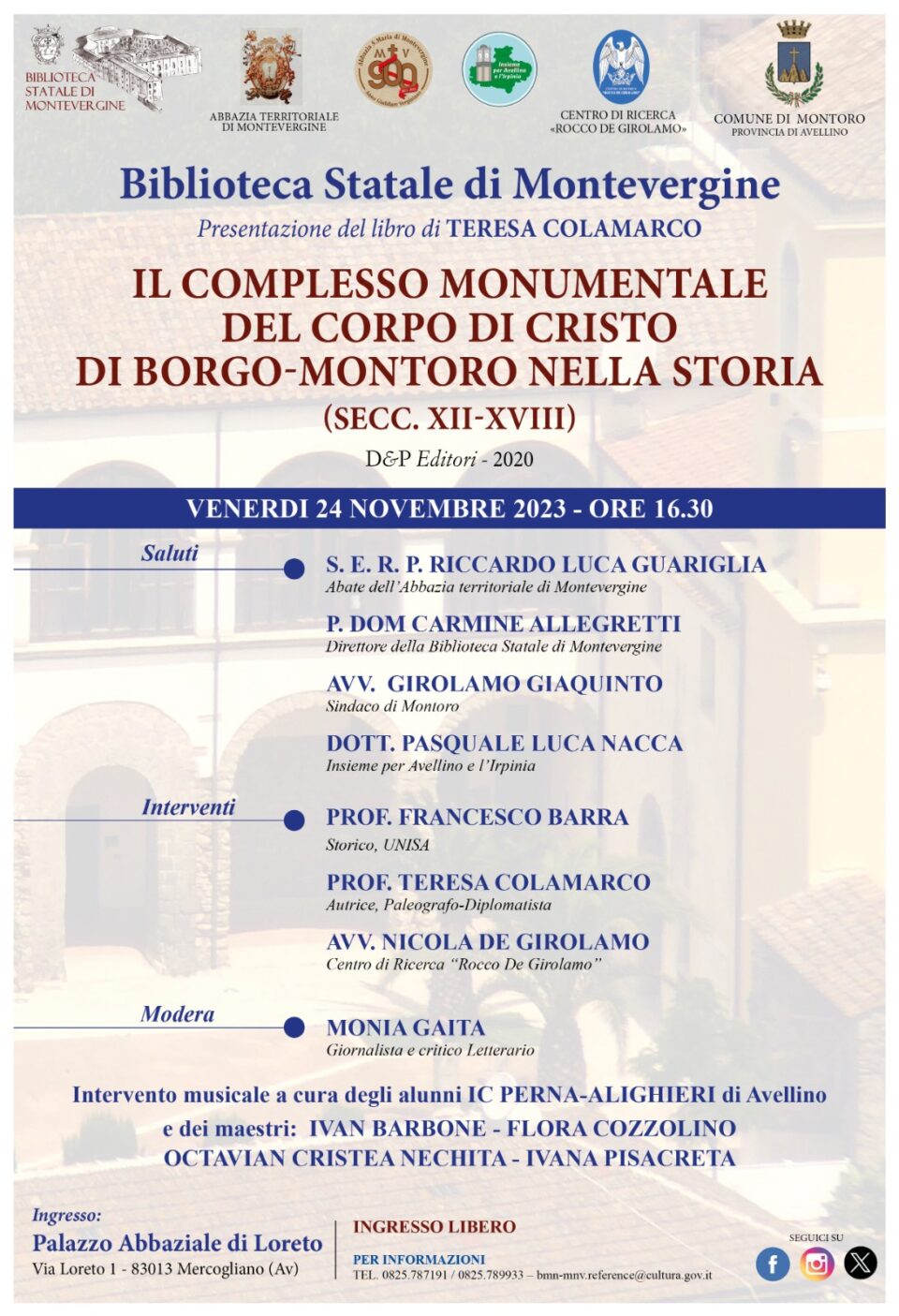 Presso la biblioteca Statale di Montevergine il prossimo 24 novembre alle ore 16.30 ci sarà la  presentazione del libro di Teresa Colamarco “ Il complesso monumentale del Corpo di Cristo di Borgo-Montoro nella storia (SECC. XII-XVIII)”. L’evento sarà aperto dai saluti di  S. E. R. P. Riccardo Luca Guariglia, abate dell’Abbazia territoriale di Montevergine; P. Dom Carmine Allegretti, direttore della Biblioteca Statale di Montevergine;  avv. Girolamo Giaquinto, sindaco di Montoro;  dott. Pasquale Luca Nacca, Insieme per Avellino e l’Irpinia. Gli interventi, invece, sono affidati a:  Prof. Francesco Barra, storico – UNISA;  Prof. Teresa Colamarco autrice, paleografo-diplomatista;  avv. Nicola De Girolamo, Centro di Ricerca “Rocco De Girolamo”. A moderare i lavori sarà Monia Gaita, giornalista e critico letterario. L’intervento musicale sarà a cura degli alunni IC Perna-Alighieri di Avellino e dei maestri: Ivan Barbone , Flora Cozzolino, Octavian Cristea Nechita, Ivana Pisacreta.