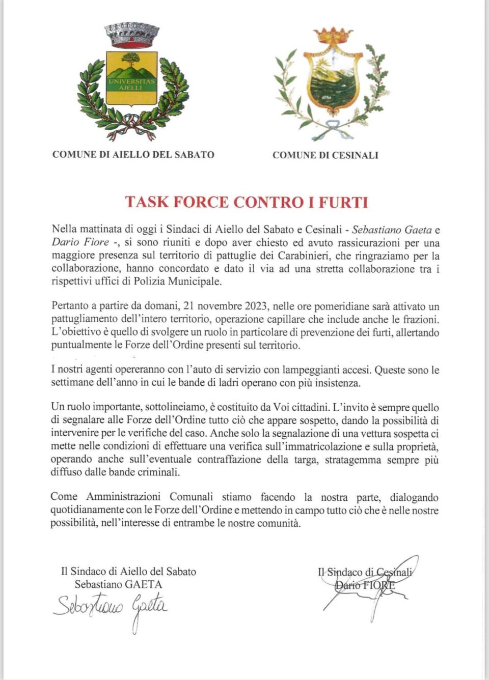 Aiello del Sabato e Cesinali insieme contro i furti. I primi cittadini dei due comuni, Sebastiano Gaeta e Dario Fiore, hanno dato vita ad una task force contando anche sulla continuità dei territori.