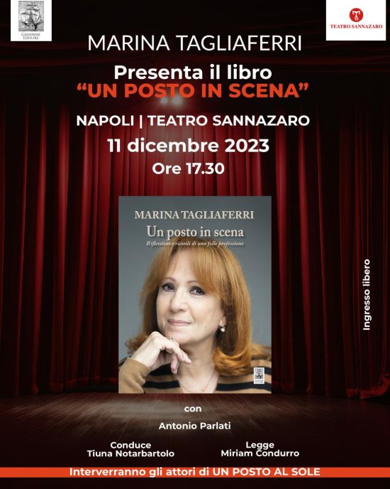 Il prossimo 11 dicembre, alle 17,30, presso il Teatro Sannazaro, in via Chiaia 157, sarà presentato il libro di Marina Tagliaferri “Un posto in scena” – Riflessioni e ricordi di una folle professione. Accanto a lei ci saranno Antonio Parlati, Direttore della Rai di Napoli, l’attrice Miriam Candurro, a cui sono affidate le letture, gli attori/colleghi di “Un posto al sole”. Condurrà la giornalista Tiuna Notarbartolo.
