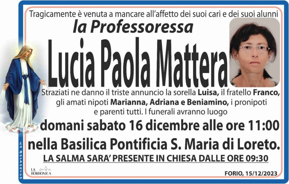 A Forio d’Ischia l’addio a Lucia Mattera, la stimata e benvoluta Professoressa ischitana investita da un camion a Pietradefusi dove insegnava al liceo classico. La cerimonia religiosa si terrà domani 16 dicembre alle 11.00 nella Basilica Pontificia Santa Maria di Loreto. Alla professoressa gli alunni hanno dedicato i versi della poesia, scritta proprio dalla Mattera, “La Vita non muore”: “Che l’accolgano, stelle, nel buio e nel freddo! Le sia culla la luna con il suo letto d’argento”.