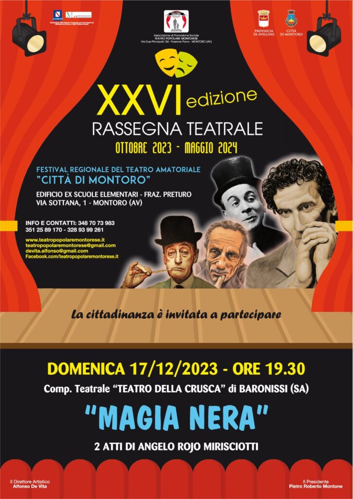 Domenica alle ore 19,30, La Compagnia “TEATRO DELLA CRUSCA” di Baronissi (SA) metterà in scena la classica opera di Angelo Rojo Mirisciotti “MAGIA NERA!” In questa serata anche quest’anno sarà ospite la Confraternita del Santissimo Sacramento di Piano, Parrelle e Preturo per una serata di sincera riflessione e per un conviviale scambio di Auguri.