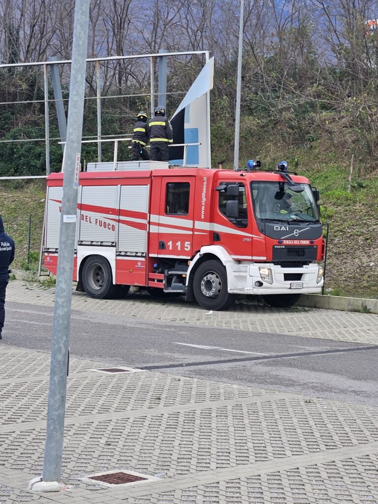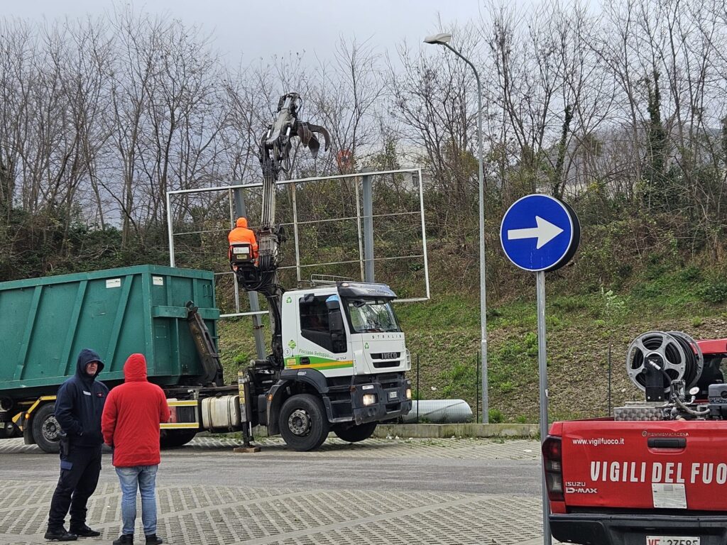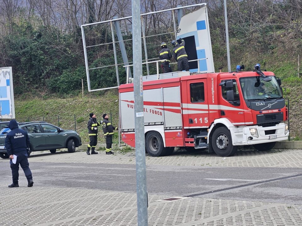Il forte vento sta creando non pochi problemi in diversi comuni della Valle dell’Irno. Nelle immagini l’intervento dei vigili del fuoco, della polizia locale e del soccorso stradale nel parcheggio di via Fratelli Napoli a Lancusi dove il vento ha danneggiato gravemente un cartellone pubblicitario i cui pezzi sono volati danneggiando anche alcune auto in sosta. Piante spezzate a Baronissi in via Salvatore Allende. Precauzionalmente i sindaci stanno adottando in diversi comuni ordinanze di chiusura di cimiteri, parchi e giardini pubblici.