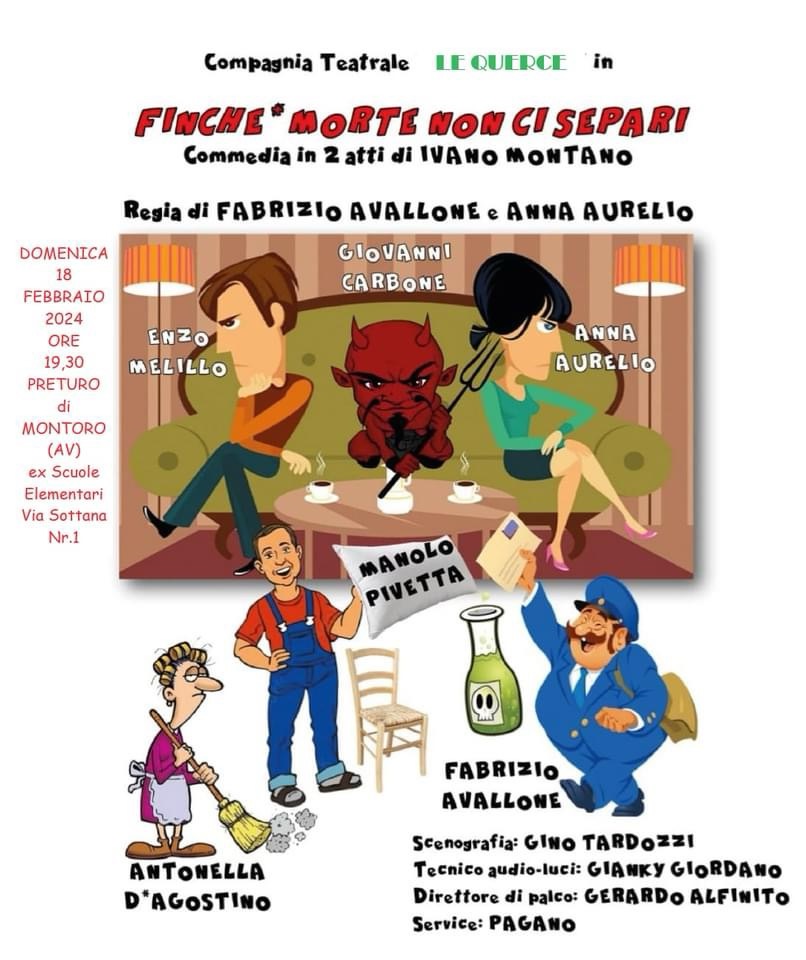 Nuovo appuntamento con il teatro domani alle ore 19,30 nell’ex Scuole Elementari di Preturo di Montoro in via Sottana. Il“ XXVI Festival Regionale del Teatro Amatoriale Città di Montoro” propone la compagnia “LE QUERCE” di Pellezzano. Cosa può succedere quando nascono incomprensioni in una coppia e terze persone s’intrufolano ? Tutto può accadere!! E’ questa la sintesi dello spettacolo“FINCHE’ MORTE NON CI SEPARI”, due atti, scritta da Ivano Montano, regia di Fabrizio Avallone e Anna Aurelio. La commedia parla di un normalissimo menage tra coniugi, ma ad un certo punto entra in scena il diavolo che, ora parlando all’orecchio della moglie, ora parlando all’orecchio del marito, li mette sempre di più l’uno contro l’altro tra gag esilaranti e colpi di scena inaspettati. Non vedere è una punizione!