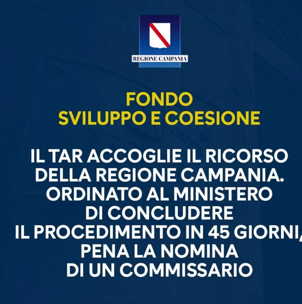 Con sentenza n.1178 di oggi, il TAR Campania ha accolto il ricorso della Regione Campania avverso il Ministero per le Politiche di Coesione, e ha assegnato al Dipartimento per la Coesione il termine di 45 giorni per la definizione dell’istruttoria e la predisposizione dello schema di accordo da sottoscrivere con la Regione Campania, riservandosi la nomina di un commissario ad acta nell’ipotesi di elusione del termine stabilito.