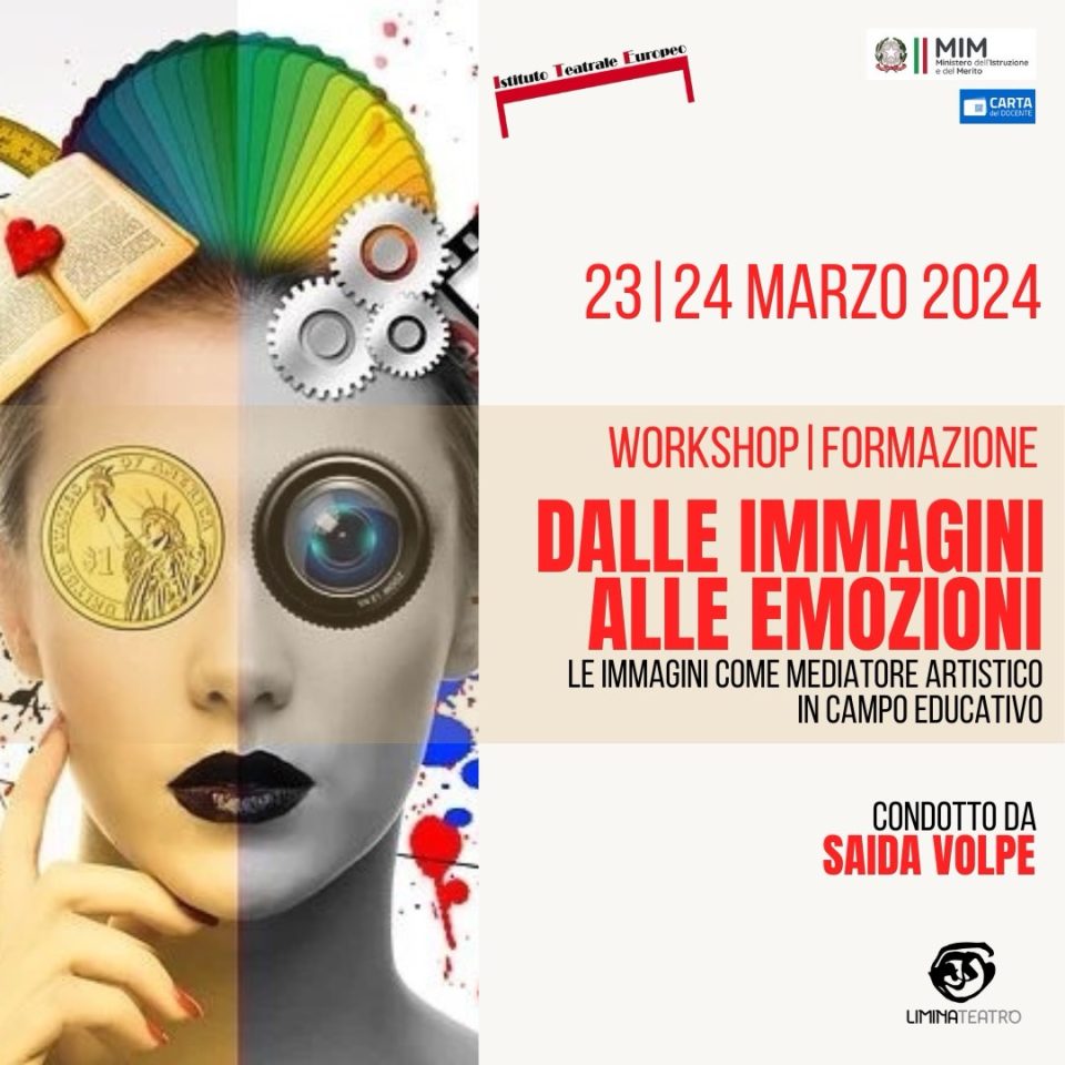 Il workshop “Dalle immagini alle emozioni” si terrà il 23 e 24 marzo 2024, dalle ore 9.30 alle 18.30 presso la sala di Limina Teatro in Via Sant’ Antonio Abate 1/C-Avellino e sarà condotto da Saida Volpe (Arte Teatro Terapista, Pedagogista, Fotografa)