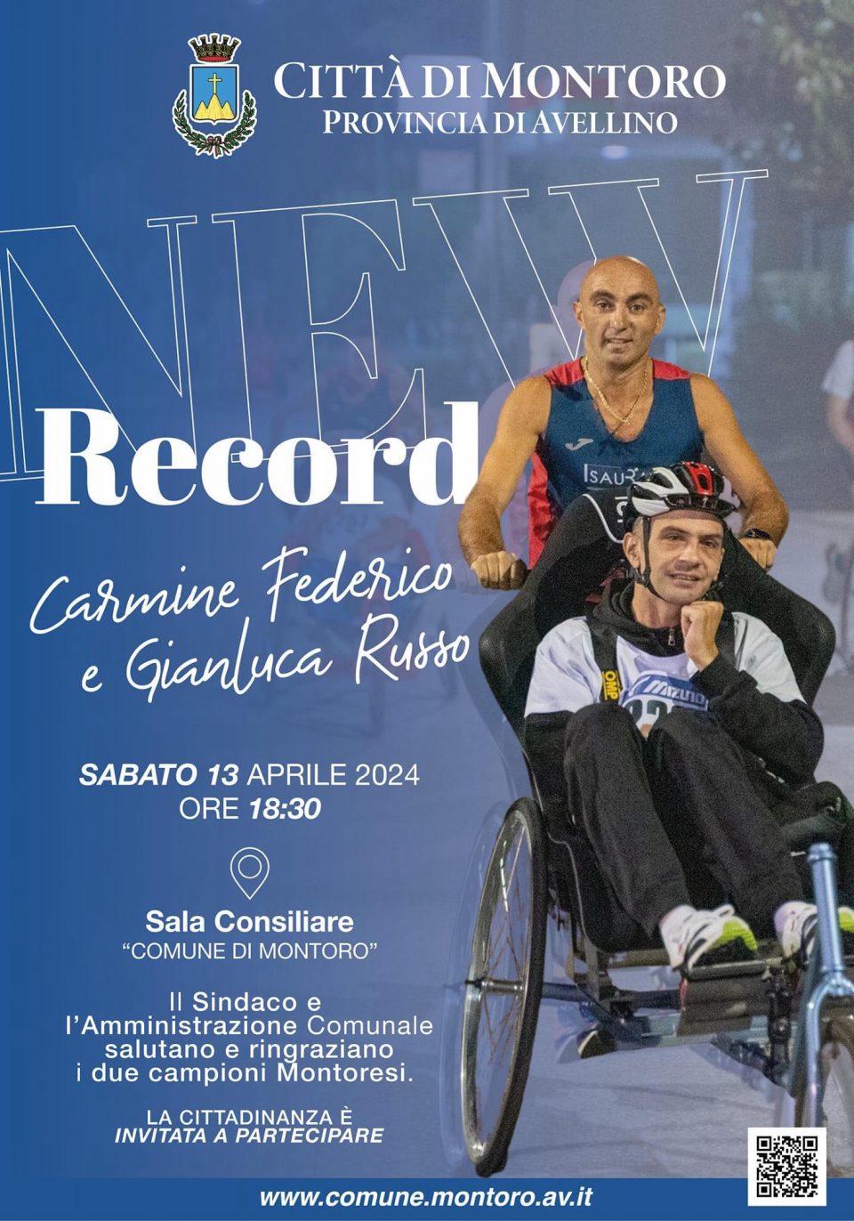 Gli atleti e detentori del GuinnessWorldRecords Carmine Federico e Gianluca Russo questo pomeriggio saranno omaggiati dal sindaco e l’amministrazione comunale di Montoro. I nuovi detentori del record mondiale alle ore 18:30 saranno accolti dal primo cittadino Girolamo Giaquinto nella Sala Consiliare di palazzo dell’Annunziata in piazza Michele Pironti. Un doveroso e sentito saluto nonché ringraziamento per le emozioni donate ad una intera comunità dai due campioni Montoresi.