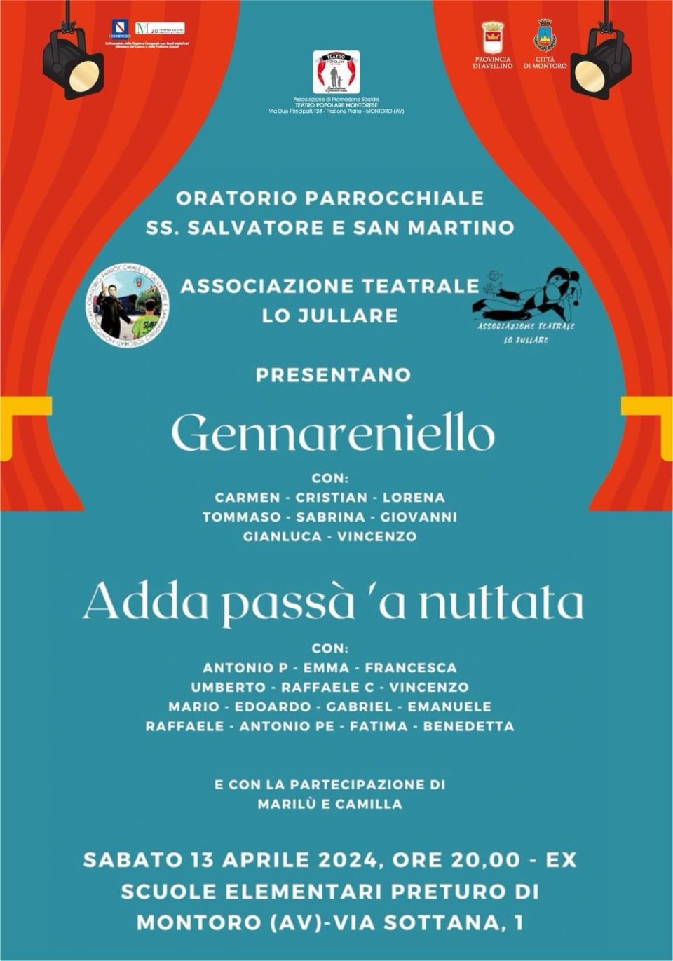 In scena la Compagnia “LO JULLARE” della frazione Torchiati di Montoro. Dopo quindici anni il gruppo si è completamente rinnovato, diretto da Alfredo Taiani e in collaborazione con l’Oratorio Parrocchiale SS. Salvatore e San Martino, presenteranno due atti unici tratti dalle commedie del grande Eduardo: “Gennareniello” e “Adda passa’ ‘a nuttata”.