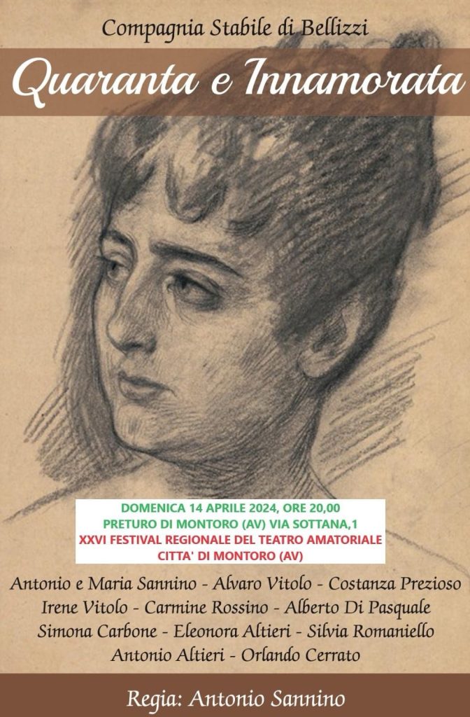 DOMENICA SEMPRE ALLE ORE 20,00 in scena sale la Compagnia Teatrale ”STABILE” di Bellizzi (SA) presenterà una nuova versione della commedia di MARIA SANNINO: “QUARANTA E INNAMORATA” con la regia di ANTONIO SANNINO. Don Pasquale Di Domenico, vedovo da molti anni, ha 3 figlie: due di loro sono giovani, belle, ben curate, alla moda… fidanzate! L’altra, Sesella, ha 40 anni, è zitella e vive come una donna d’altri tempi, sempre pronta ad occuparsi della casa e ad accudire la famiglia. Sesella, apparentemente felice, in realtà vive malinconicamente ed è questa infelicità che spingerà il padre a trovarle un marito a tutti i costi! La commedia, ambientata nella Napoli borghese degli anni ’50, è ricca di momenti comici, a tratti esilaranti ed è adatta ad ogni età. Il rapporto tra Sesella ed il padre ci regala invece, sipari di grande tenerezza! Colorata, frizzante, dai ritmi incalzanti, ma conserva il gusto per il teatro di tradizione napoletano. La Compagnia la mette in scena da 5 anni ed ha partecipato a diverse rassegne in tutta Italia. La scorsa estate ha partecipato al premio “IL GIOGO” di Monte San Savino (Arezzo) e Maria Sannino si è aggiudicato il premio come miglior attrice protagonista mentre la Compagnia ha vinto il secondo premio per l’alta qualità della messa in scena.