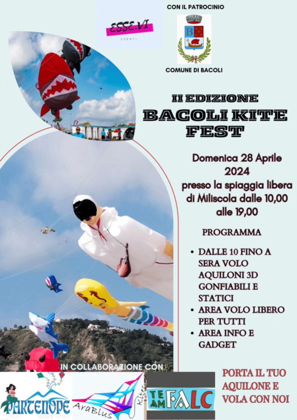 Il Bacoli Kite Fest, giunto alla seconda edizione, si svolgerà sulla spiaggia libera di Miliscola domenica 28 aprile, dalle 10.00 alle 19.00.Qui tutti gli appassionati potranno portare i propri aquiloni per farli volare insieme agli altri. “Sarà un’esperienza emozionante e divertente, che unisce la bellezza del volo degli aquiloni con la spettacolarità della spiaggia di Bacoli”, spiegano gli organizzatori. Anche in questa seconda edizione voleranno aquiloni di ogni genere, giganti, in 3D e statici. Il Bacoli Kite Fest è organizzato dall’associazione Esse.Vi eventi, con il patrocinio del Comune Bacoli e in collaborazione con Partenope Fly. All’appuntamento parteciperanno professionisti ed appassionati di volo provenienti da tutta Italia.