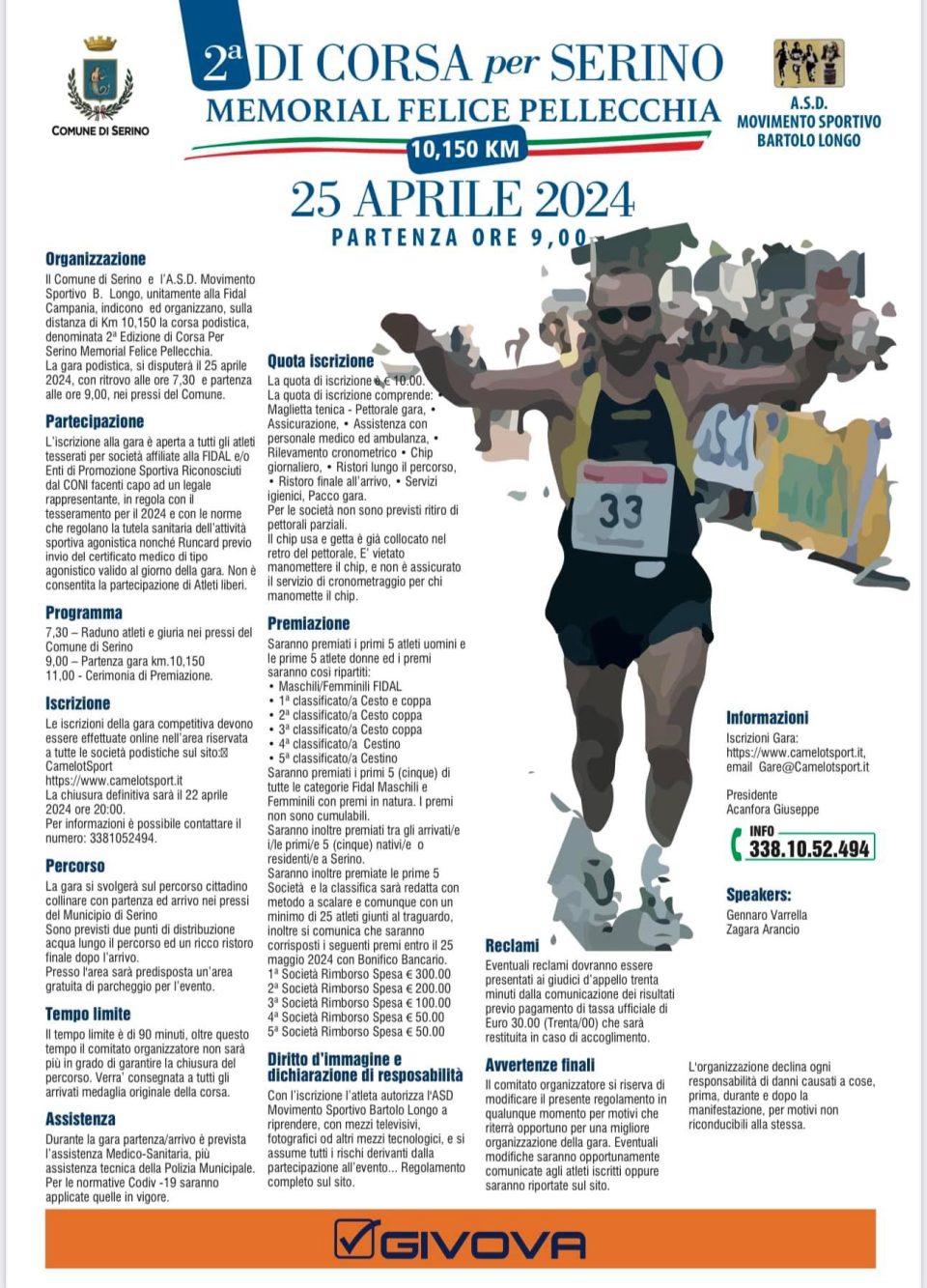 Il Comune di Serino e l’A.S.D. Movimento Sportivo Bartolo Longo, unitamente alla Fidal Campania, domani hanno organizzato una gara podistica in memoria del compianto Felice Pellecchia, serinese scomparso prematuramente nel 2007. Si tratta della seconda edizione di “Corsa per Serino, Memorial Felice Pellecchia”. Lo start alle ore 9.00. Felice Pellecchia è stato campione italiano di maratona categoria M55 e padre di Liberato Pellecchia, mezzofondista dell’Aeronautica nel giro della nazionale. Era stato anche nominato a Padova “Veterano dello Sport master” per aver concluso cinque maratone sotto le 2h40. Più di 50 le gare sui 42,195 km che il portacolori del Movimento Sportivo Bartolo Longo di Pompei aveva portato a termine, tanto che si stava allenando per attaccare prossimamente il record italiano di categoria, sfiorato per pochi secondi nel 2006. In sua memoria il comune di Serino e la società Bartolo Longo hanno voluto questo memorial a lui dedicato. La competizione si svolgerà sulla distanza di Km 10,150. La gara podistica, si disputerà con ritrovo alle ore 7,30 e partenza alle ore 9,00, nei pressi del Comune di Serino.