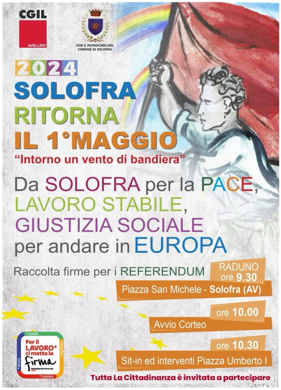 Domani la Cgil sarà a Solofra per celebrare la festa del 1° Maggio. Appuntamento alle ore 09:30 con concentramento in piazza San Michele. A seguire il corteo con arrivo in Piazza Umberto I dove si svolgerà il comizio. Aprirà con i saluti il Sindaco di Solofra Nicola Moretti, seguiranno le associazioni, mentre le conclusioni saranno affidate il segretario Generale della Cgil Avellino Franco Fiordellisi.