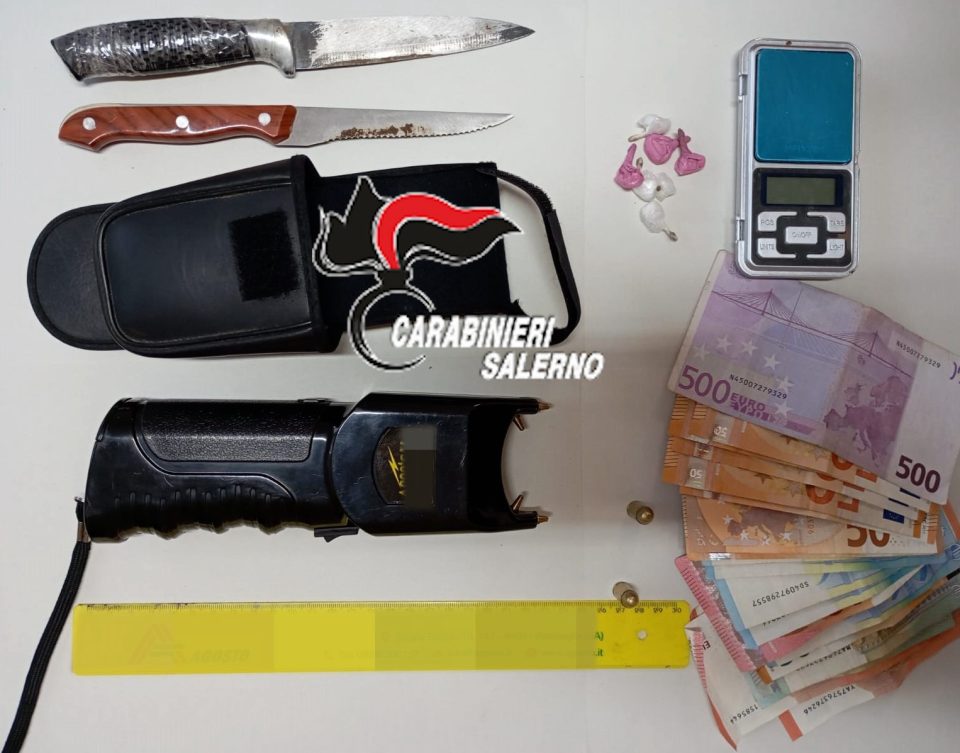 Nella notte a Pellezzano i Carabinieri dell’Aliquota Radiomobile del Nucleo Operativo e Radiomobile della Compagnia di Mercato San Severino hanno arrestato A. P., per il reato di “detenzione ai fini di spaccio di sostanza stupefacente, oltraggio e resistenza a P.U. e detenzione abusiva di armi e munizioni”, in quanto, secondo la ricostruzione della PG operante, all’ atto del controllo, lo stesso dapprima spintonato un militare e poi a seguito di perquisizione è stato trovato in possesso di sostanza stupefacente del tipo cocaina e crack suddivisa in dosi per un peso complessivo di 1,9 grammi circa, la somma in contanti di 1.150,00 euro, un bilancino di precisione, due proiettili cal. 9’17, due coltelli nonché una pistola elettrica “taser”.