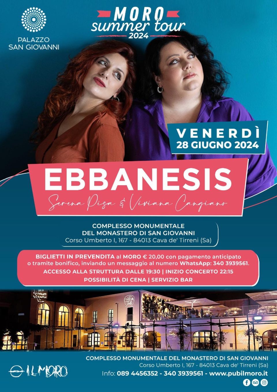 Inizia il 28 giugno il MORO SUMMER 2024,una serie di concerti live organizzati da PUB IL MORO di Cava de’ Tirreni, sotto la direzione artistica di Gaetano Lambiase .Il 28 giugno alle ore 22.15,con ingresso dalle 19.30 , presso il complesso Monumentale di S. Giovanni di Cava de’ Tirreni,il primo concerto del duo “Ebbanesis”,ovvero Viviana Cangiano e Serena Pisa . A presentare la serata il giornalista Antonio Di Giovanni.