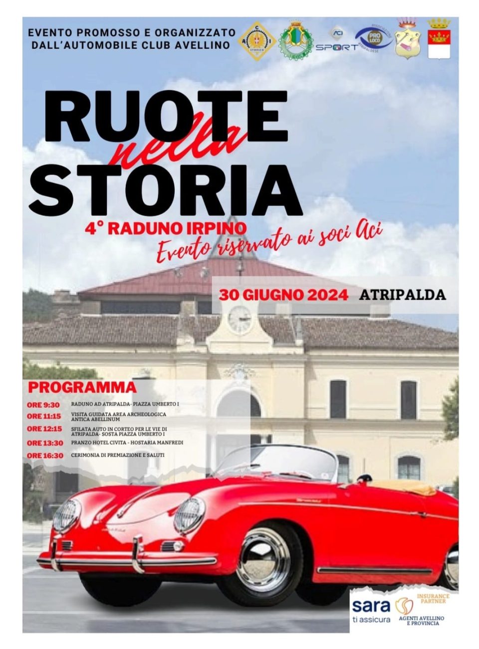 E’ in programma domenica prossima la quarta edizione di Ruote nella Storia, manifestazione dedicata alle auto d’epoca. Appuntamento ad Atripalda. Si comincia alle 9.30, con il raduno in Piazza Umberto I.  Alle 11.15 le auto storiche  sfileranno lungo le strade di Atripalda. Seguirà alle 12.00, la visita guidata dello Specus Martyrum Chiesa madre di Sant’Ippolisto Martire e dell’area archeologica dell’Antica Abellinum. Alle 16.30 la manifestazione si chiuderà con la cerimonia di premiazione. Ruote nella Storia è un evento organizzato dall’Automobile Club Avellino nell’ambito delle iniziative dell’ACI Storico. L’obiettivo, oltre a mettere in risalto i gioielli del motorismo nazionale ed internazionale, è di valorizzare i borghi del territorio.