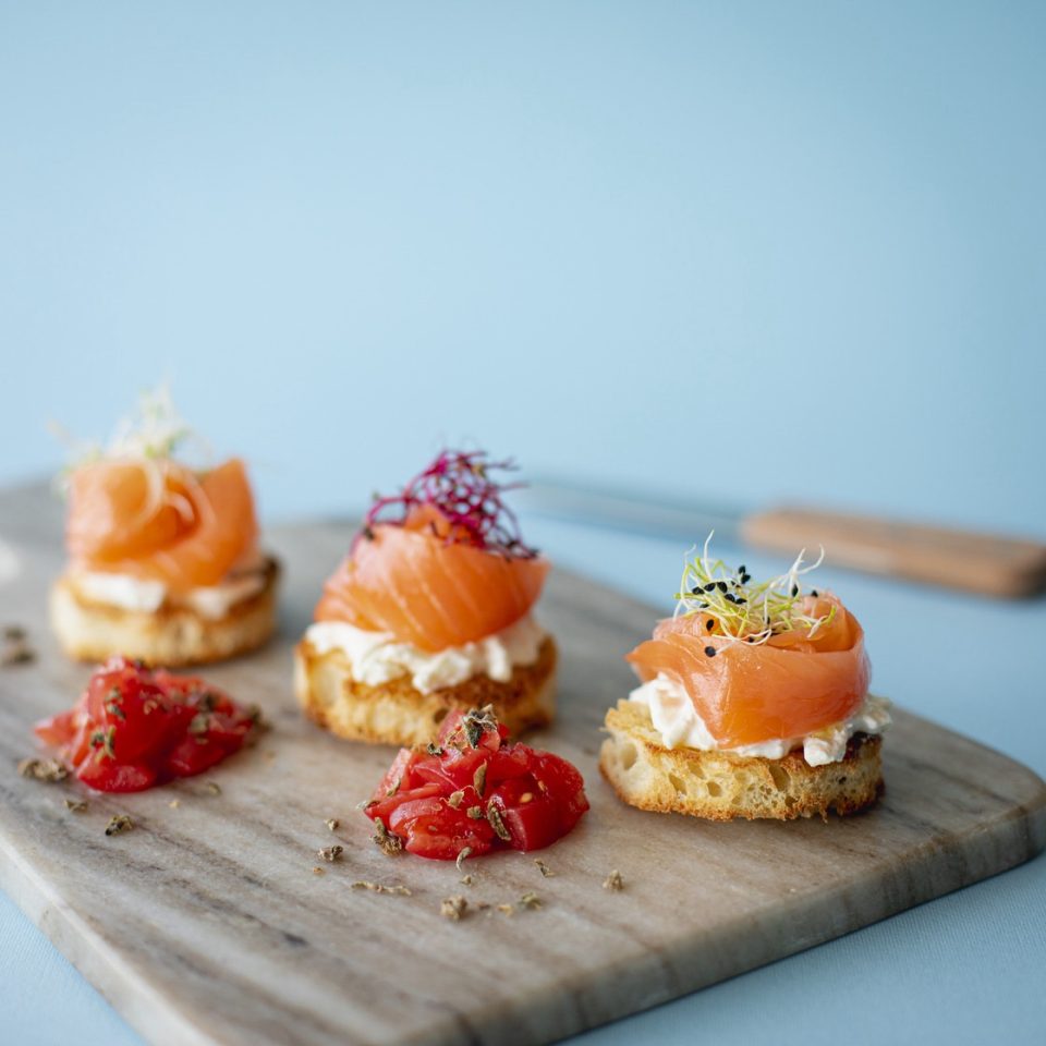Crostini di salmone norvegese affumicato Fumara, stracciatella, concassè di San Marzano e polvere di capperi di Pantelleria