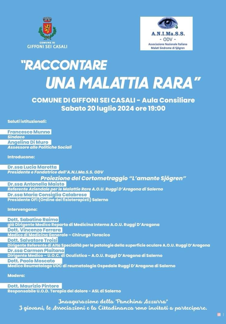 Si terrΓ  domani alle ore 19, presso l’Aula Consiliare di Giffoni Sei Casali, un convegno dal titolo: β€œRaccontare una malattia rara” organizzato dal Comune in collaborazione con l’Associazione A.N.I.Ma.S.S. (Associazione Nazionale Italiana Malati Sindrome di SjΓΆgren) odv.