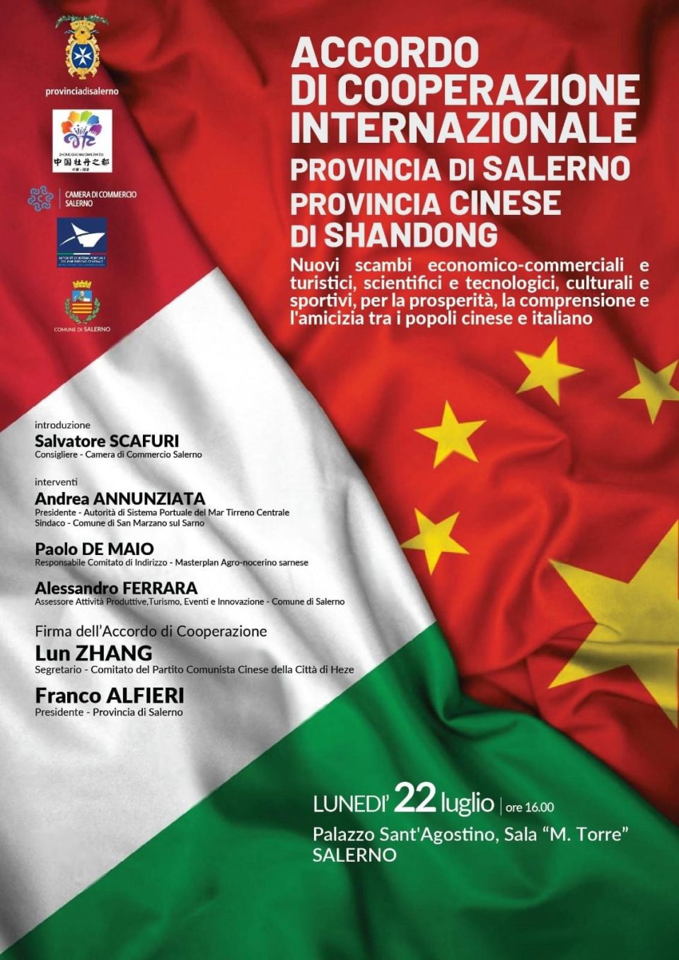 Domani p.v. alle ore 16,00, presso la sala Giunta di Palazzo Sant’Agostino si tiene un incontro pubblico di presentazione dell’Accordo di cooperazione internazionale che viene siglato tra la Provincia di Salerno, rappresentata dal presidente Franco Alfieri, e la Città-prefettura di HEZE della provincia dello Shandong della Repubblica popolare cinese, rappresentata dal Segretario del Comitato del Partito Comunista Cinese della Città di Heze, Lun Zhang.