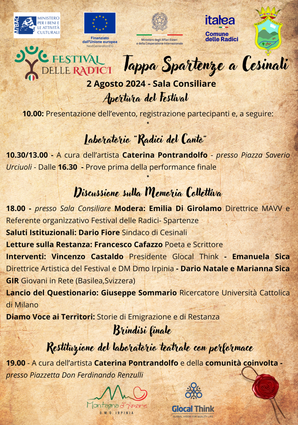 Interventi: Vincenzo Castaldo Presidente Glocal Think -Emanuela Sica Direttrice Artistica del Festival e DM Dmo Irpinia -Dario Natale e Marianna Sica GIR Giovani in Rete (Basilea,Svizzera)