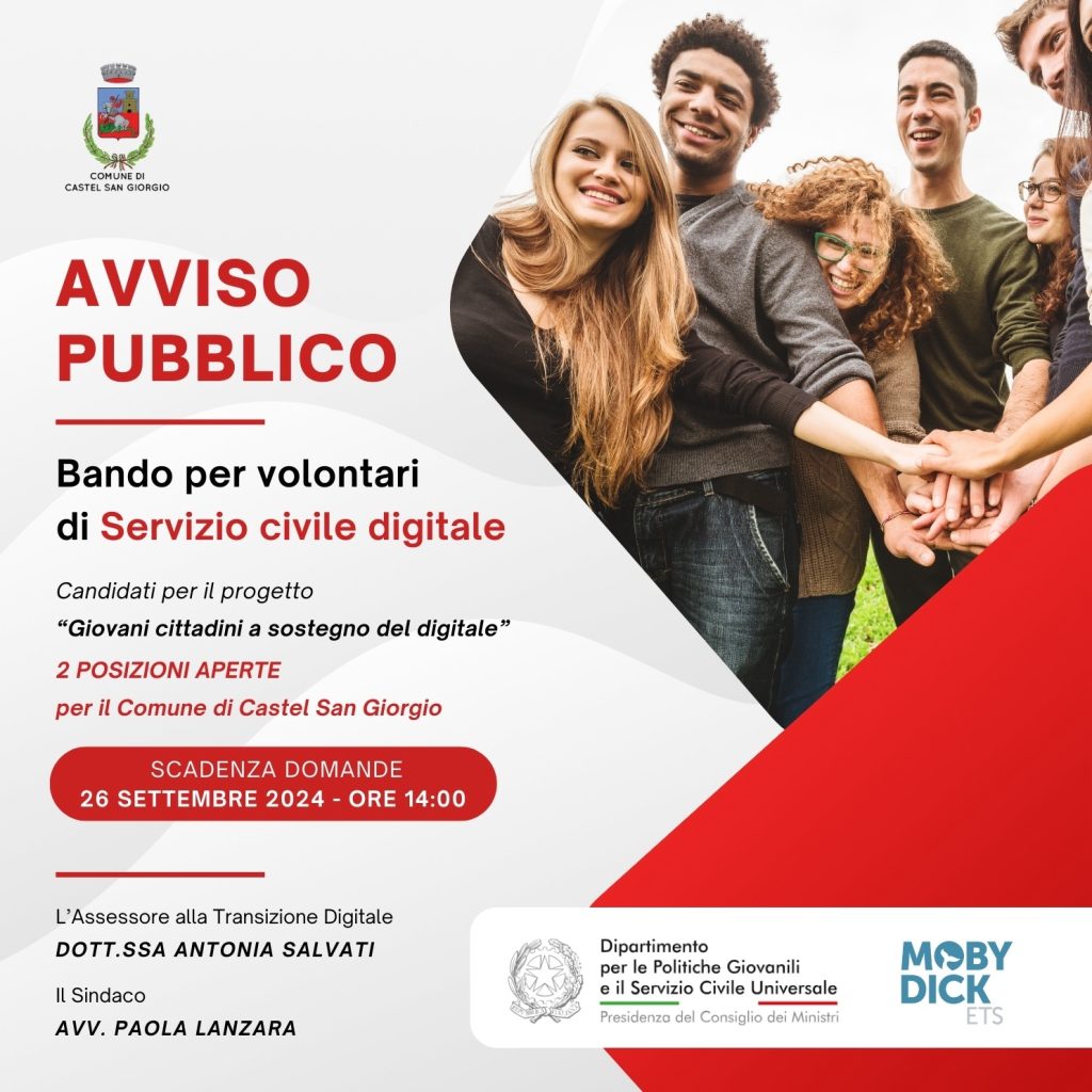Servizio Civile Digitale, 2 posti al Comune di Castel San Giorgio. Le candidature entro il 26 settembre. Si parte tra novembre e dicembre