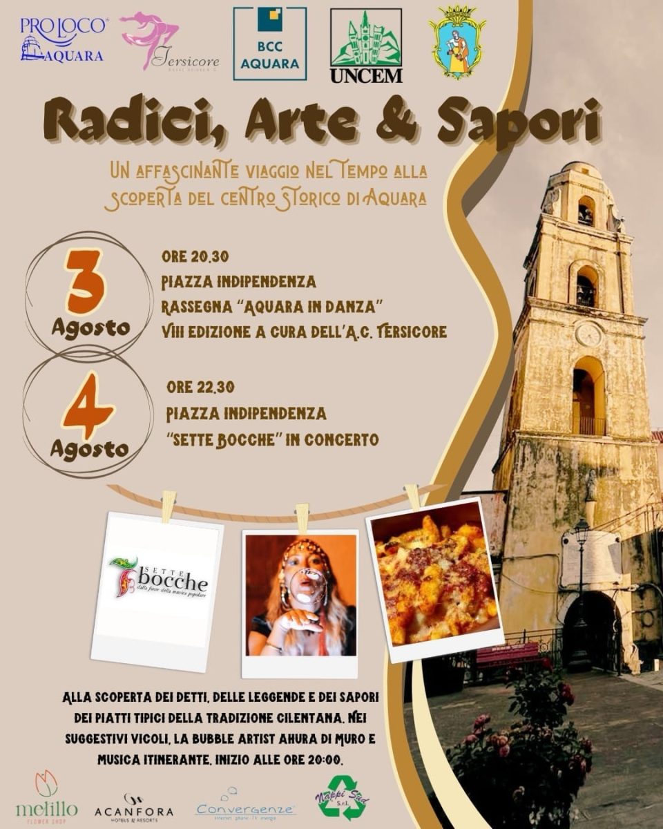 La prima serata, il 3 agosto, sarà arricchita da “Aquara in Danza”, una spettacolare rassegna organizzata in collaborazione con l’associazione Tersicore. Diverse scuole di danza del territorio si esibiranno in Piazza Indipendenza, creando una sinfonia di movimenti che incanteranno il pubblico. La danza, con la sua capacità di trasmettere emozioni e raccontare storie, si unirà alla magia del nostro borgo, regalando una serata indimenticabile.