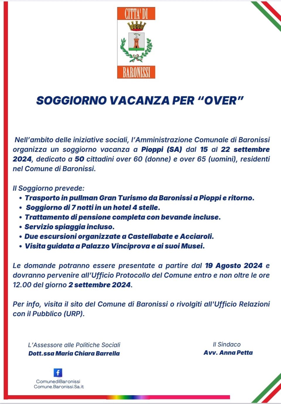 L’Amministrazione comunale di Baronissi ha pianificato un soggiorno vacanza dedicato ai cittadini over 65, che si terrà a Pioppi (SA) dal 15 al 22 settembre 2024. L’iniziativa coinvolgerà 50 residenti, offrendo loro un’opportunità di relax, svago e scoperta delle bellezze del Cilento. Il soggiorno prevede una settimana di pensione completa presso un hotel a 4 stelle, con servizi inclusi come il trasporto in pullman Gran Turismo, il servizio spiaggia, e due escursioni giornaliere a Castellabate e Acciaroli, oltre a una visita guidata a Palazzo Vinciprova e ai suoi musei.