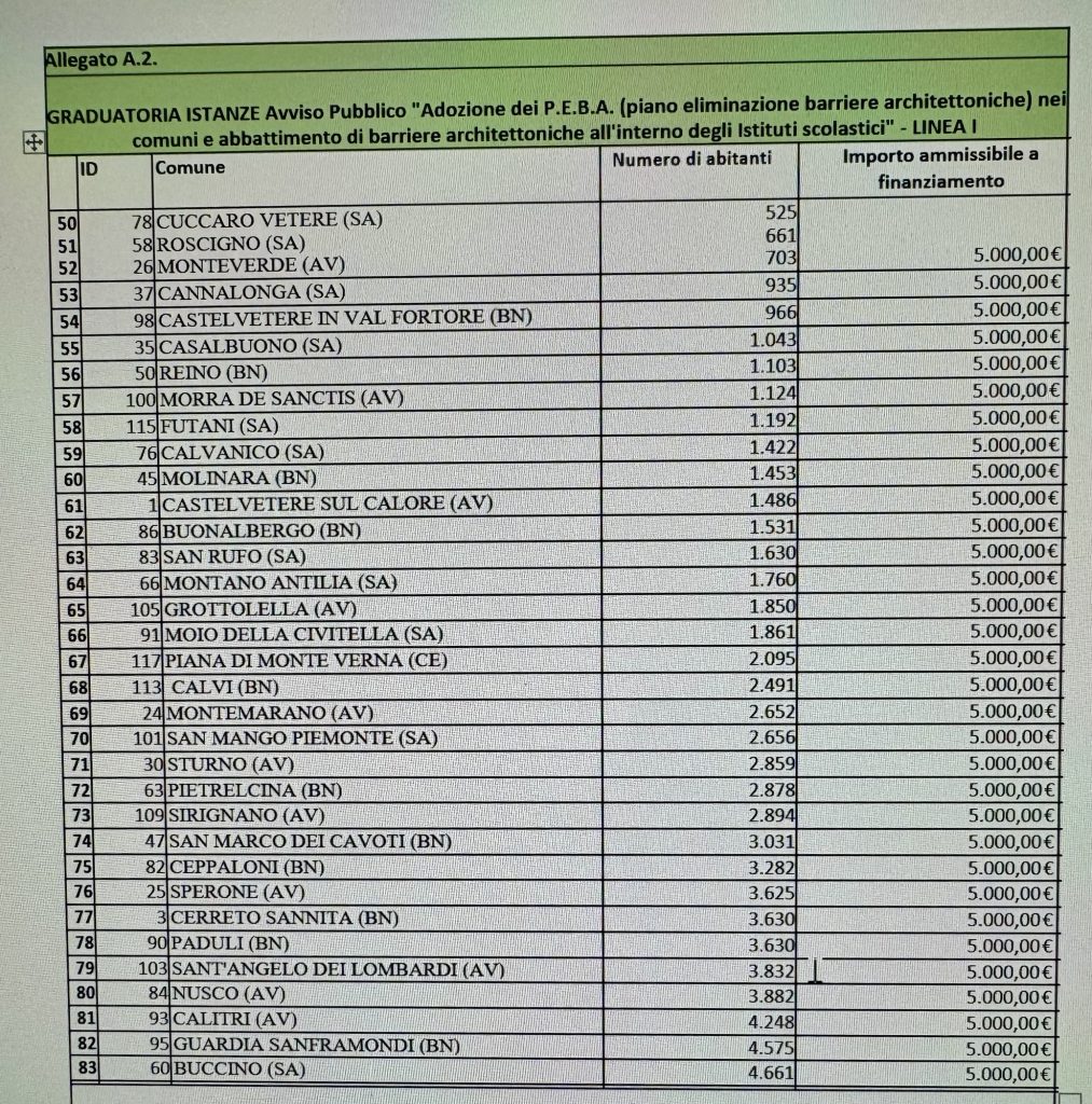 La Regione Campania ha reso noto l’elenco dei comuni che hanno ottenuto fondi nell’ambito del piano per l’eliminazione delle barriere architettoniche all’interno degli Istituti scolastici. 94 i comuni che hanno ottenuto un finanziamento per l’eliminazione delle barriere architettoniche all’interno degli Istituti scolastici con importi che vanno dai 5mila ai 15 mila euro. Tra gli enti finanziati: Mercato San Severino; Baronissi, Solofra, Fisciano; Bracigliano, Vietri Sul Mare, Cava De’ Tirreni e i due Nocera.
