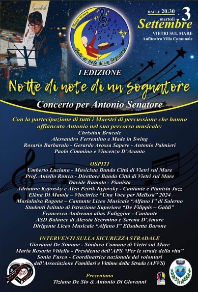 Sarà il suggestivo anfiteatro della villa comunale di Vietri sul Mare a fare da cornice, il 3 settembre prossimo, alle ore 20.30, a “Notte di note di un sognatore – Concerto per Antonio Senatore”, prima edizione dell’evento musicale dedicato al giovane vietrese prematuramente scomparso il 24 settembre del 2023.