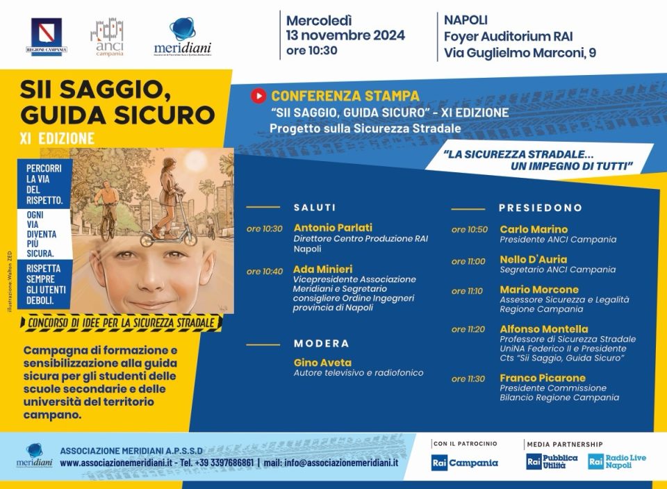 Il prossimo giorno 13 novembre 2024 alle ore 10:30 nel foyer del Centro di produzione Rai Napoli si terrà la conferenza di presentazione della XI Edizione della campagna di formazione e sensibilizzazione alla guida sicura denominata “Sii Saggio, Guida Sicuro”.