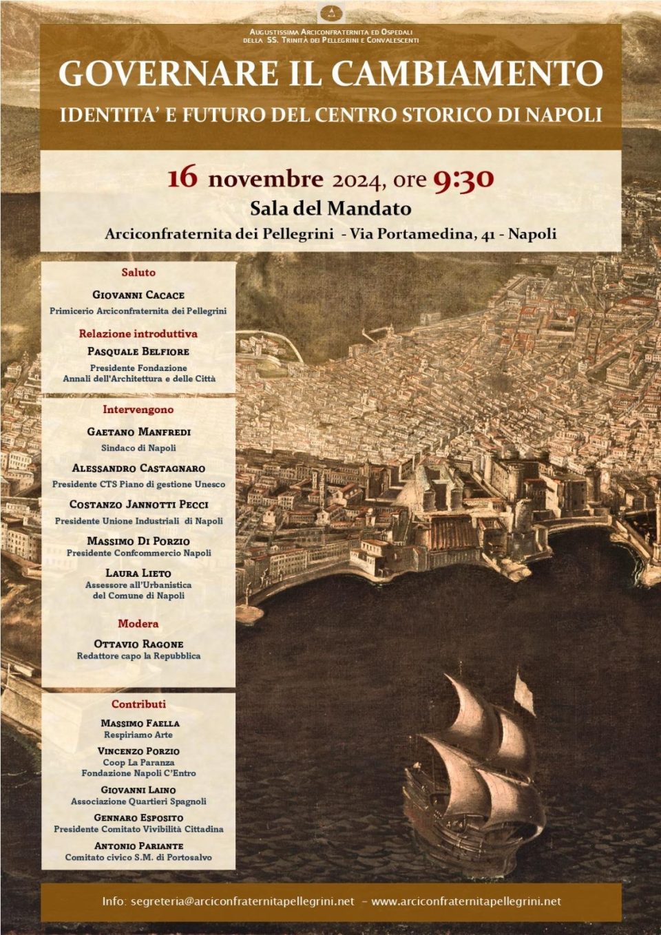 È tutto pronto a Napoli per il convegno dal titolo “Governare il Cambiamento – Identità e futuro del centro storico di Napoli”, che si svolgerà il prossimo sabato 16 novembre, a partire dalle ore 9.30, presso la Sala del Mandato dell’Arciconfraternita dei Pellegrini, in via Portamedina 41. Dopo il saluto del Primicerio dell’Arciconfraternita dei Pellegrini, Gianni Cacace, e la relazione introduttiva di Pasquale Belfiore Presidente della Fondazione Annali dell’Architettura e delle Città, si confronteranno sul futuro del centro storico di Napoli: Alessandro Castagnaro, Presidente CTS Piano di gestione Unesco, Costanzo Jannotti Pecci, Presidente Unione Industriali di Napoli, Massimo Di Porzio, Presidente Confcommercio Napoli, mentre in rappresentanza dell’amministrazione comunale di Napoli saranno presenti Laura Lieto, Assessore all’Urbanistica, e il sindaco Gaetano Manfredi, che concluderà i lavori.
