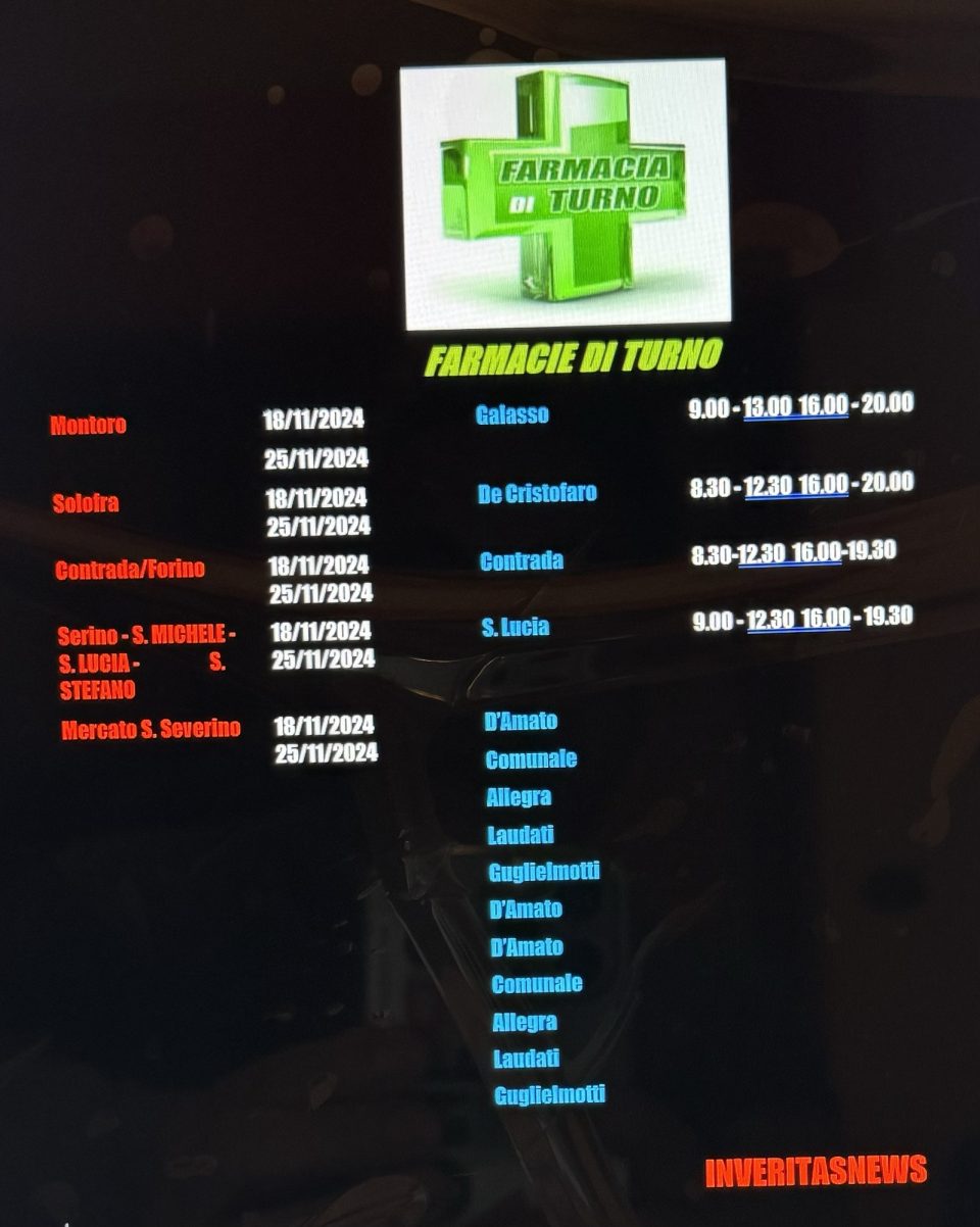 Salute e benessereFarmacie di turno di Redazione Inveritas19 Novembre 2024180 Condividi0 Dal 18 al 25 novembre 2024 Condividi: Condividi su Facebook (Si apre in una nuova finestra) Facebook Condividi su X (Si apre in una nuova finestra) X