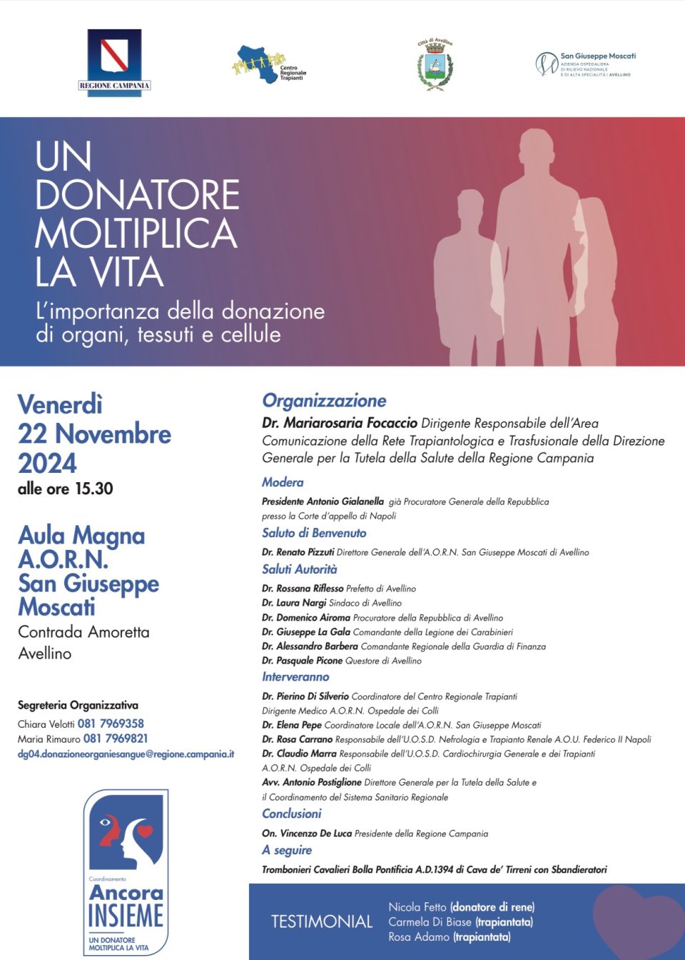 Al convegno si alterneranno le voci delle istituzioni – con gli interventi, tra gli altri, del Prefetto di Avellino, Rossana Riflesso, del sindaco Laura Nargi, del Procuratore della Repubblica Domenico Airoma, del Questore Pasquale Picone, oltre che dei Comandanti provinciali e regionali dei Carabinieri, dei Vigili del Fuoco e della Guardia di Finanza; del nuovo Coordinatore del Centro regionale Trapianti, Pierino Di Silverio, del Direttore generale per la Tutela della Salute e il Coordinamento del Sistema Sanitario regionale, Antonio Postiglione – a momenti di riflessione, anche attraverso la proiezione di un video, che, in particolare, racconterà la storia della donazione degli organi e come la necessità di un trapianto sconvolga la vita dei pazienti e delle loro famiglie. Dopo le conclusioni affidate al Presidente De Luca, all’esterno della Città ospedaliera si terrà un’esibizione dei Trombonieri Cavalieri con bolla pontificia del 1394 di Cava dei Tirreni con sbandieratori.