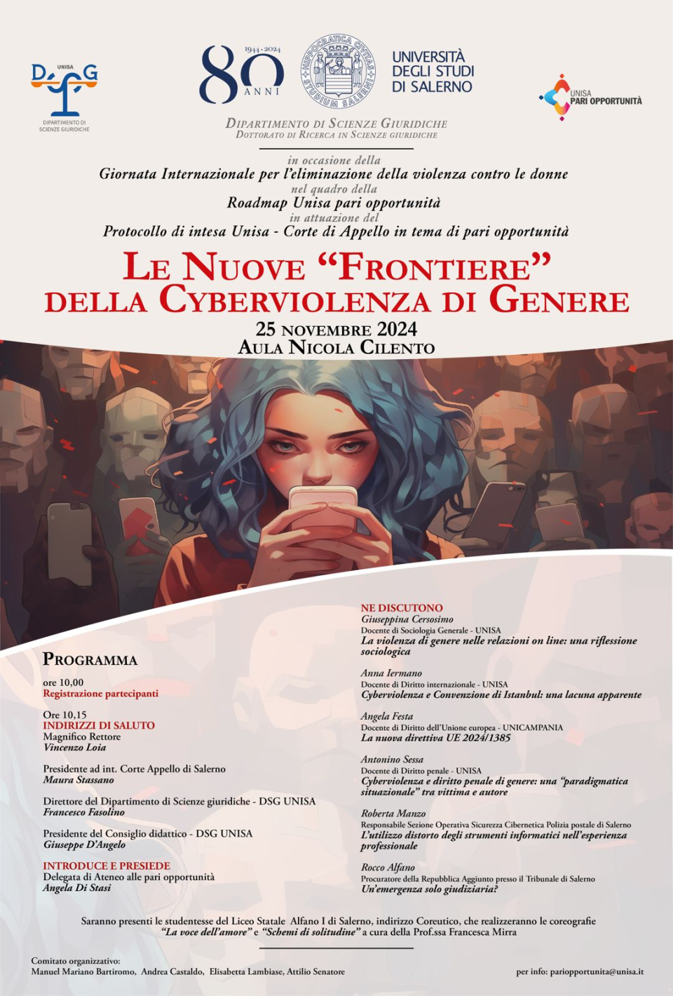 L’iniziativa, promossa nell’ambito della Roadmap di Ateneo in tema di Pari Opportunità, lanciata l’8 marzo 2023 e proseguita per il 2024, e in attuazione del Protocollo di intesa UNISA-Corte d’Appello di Salerno in tema di Pari Opportunità, approfondirà varie questioni legate alle nuove forme di violenza di genere, alla luce del collegamento violenza/genere/cyberspazio, realizzando un momento di significativa sinergia tra Accademia ed istituzioni giudiziarie e scolastiche.