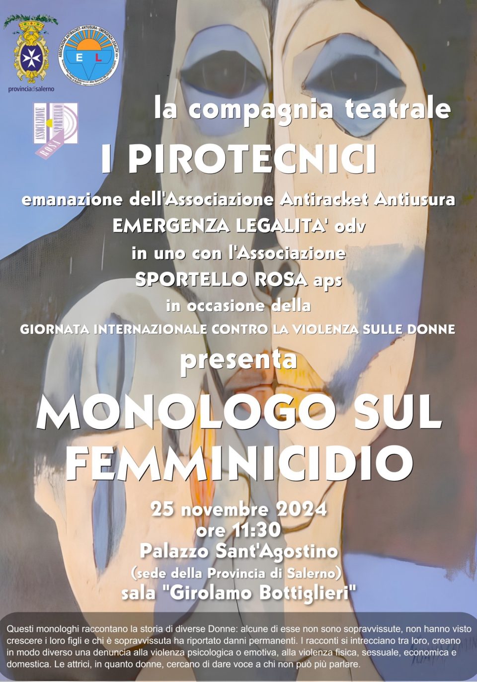In occasione della Giornata Internazionale contro la Violenza sulle Donne si terrà alle ore 11,30 di lunedì 25 novembre 2024 presso la sala “Girolamo Bottiglieri” di Palazzo S. Agostino, sede dell’ente Provincia di Salerno, l’evento teatrale dal titolo “Monologo sul Femminicidio”, organizzato dall’associazione antiracket e antiusura Emergenza Legalità Odv presieduta dal dott. Luigi Frezzato in collaborazione con l’associazione Sportello Rosa Aps. All’incontro parteciperanno autorità civili e militari.