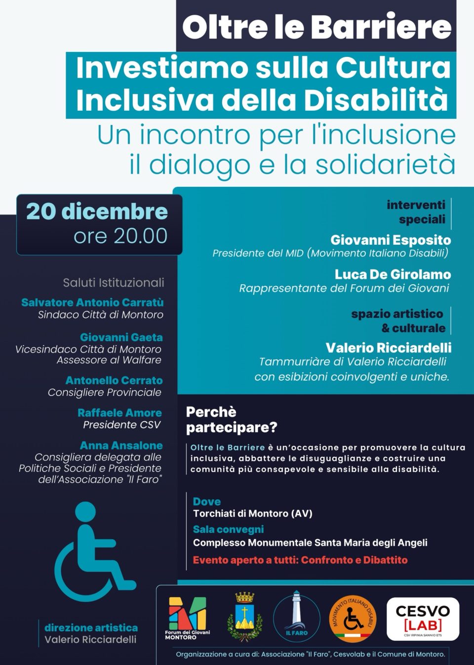 Il prossimo 20 dicembre, alle ore 20:00, presso la Sala Convegni del Complesso Monumentale Santa Maria degli Angeli a Torchiati di Montoro, si terrà l’evento “Oltre le Barriere”, un’iniziativa dedicata alla promozione della cultura inclusiva e all’abbattimento delle barriere architettoniche e sociali.