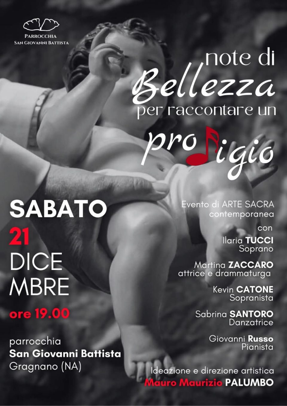 “Note di bellezza per raccontare un prodigio” è il titolo dello spettacolo che prenderà forma sabato 21 dicembre, alle 19, nella Parrocchia San Giovanni Battista di Gragnano (Napoli). Un evento di arte sacra contemporanea, perfetto mix di musica, danza, canto, prosa e cultura alla spiritualità, con ingresso libero e gratuito, che vedrà in scena il soprano Ilaria Tucci, l’attrice e drammaturga Martina Zaccaro, il sopranista Kevin Catone, la danzatrice Sabrina Santoro e il pianista Giovanni Russo. L’ideazione e la direzione artistica portano, invece, la firma di Mauro Maurizio Palumbo, artista e docente dell’Accademia di Belle Arti di Napoli, focalizzato sulla sperimentazione del teatro minimo e sulla performance art, che per l’occasione, ha voluto ricreare uno spazio in cui l’arte diventa mezzo per emozionare, riflettere e condividere la bellezza del sacro in tutte le sue forme.