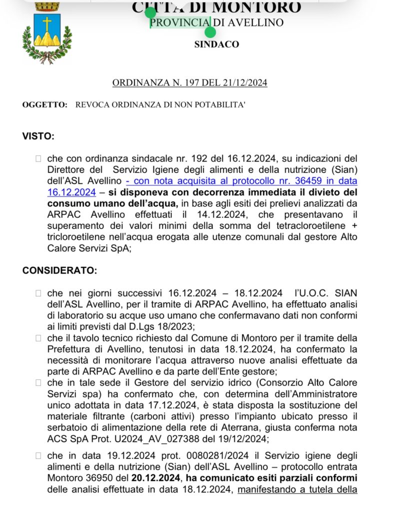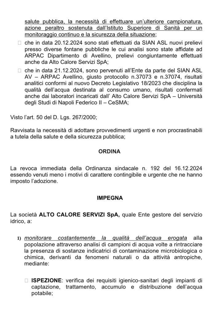 “La revoca immediata della Ordinanza sindacale n. 192 del 16.12.2024 essendo venuti meno i motivi di carattere contingibile e urgente che ne hanno