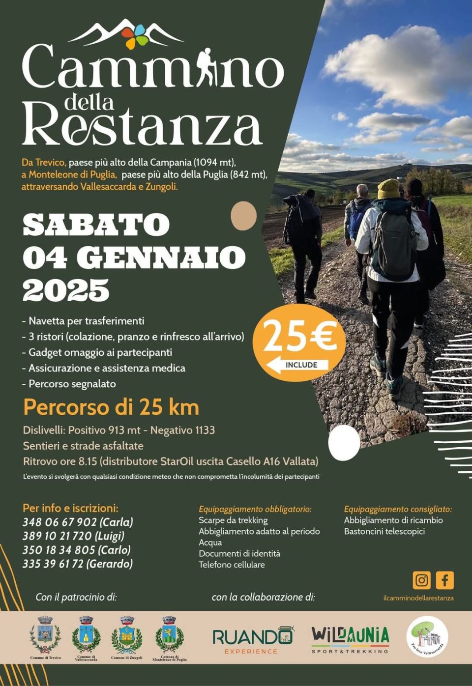 La partenza è prevista il 4 gennaio 2025 alle ore 9.00 dal centro storico di Trevico ove i partecipanti arriveranno mediante un servizio navetta che presso dall’uscita del Casella Autostradale di Vallata farà la spola con il paese più alto della Campania. La quota di iscrizione è di 25€(che scendono a 15€ per gli under 15) e comprende fra l’altro anche un servizio navetta per i tratti più impegnativi.