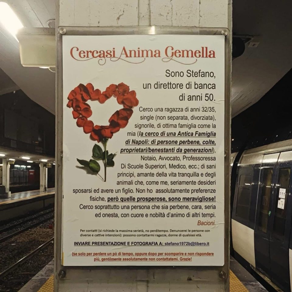 Un signore vuole affigere una “ricerca di anima gemella” (ignora evidentemente che oggi ci sono app per incontri molto più comode).