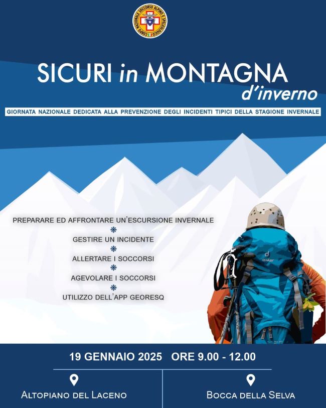 Domenica ๐Ÿญ๐Ÿต ๐—š๐—˜๐—ก๐—ก๐—”๐—œ๐—ข ritorna la giornata nazionale dedicata alla prevenzione degli incidenti in montagna nella stagione invernale โ€œ๐‘บ๐‘ฐ๐‘ช๐‘ผ๐‘น๐‘ฐ ๐‘ฐ๐‘ต ๐‘ด๐‘ถ๐‘ต๐‘ป๐‘จ๐‘ฎ๐‘ต๐‘จ ๐’…โ€™๐’Š๐’๐’—๐’†๐’“๐’๐’โ€. Il Soccorso Alpino Speleologico Campania – CNSAS ha organizzato l’evento in due location dove vi saranno stand informativi e dimostrativi, temi tra cui: