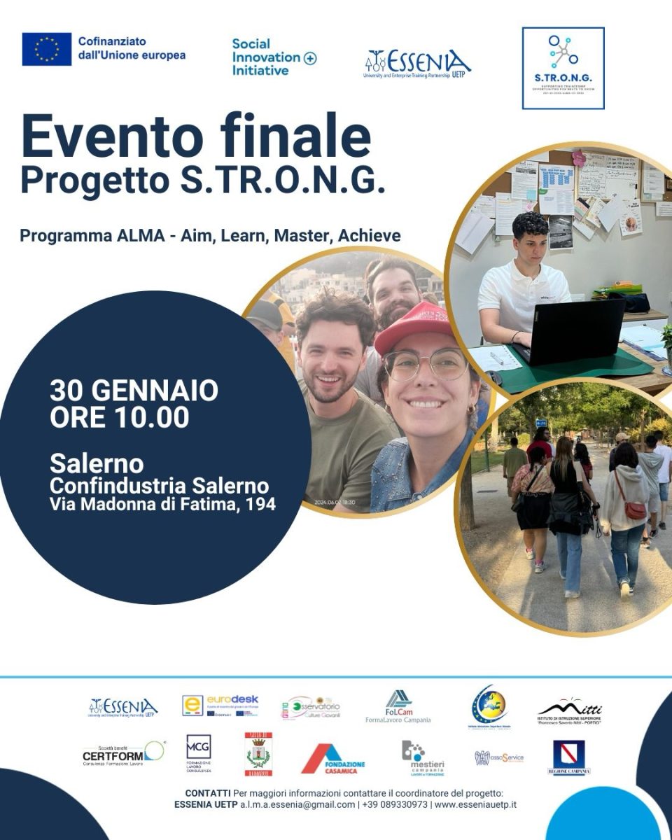 Il prossimo 30 gennaio, alle ore 10:00, presso la sede di Confindustria Salerno, avrà luogo l’evento finale del progetto “S.TR.O.N.G. – Supporting TRaineeship Opportunities for NEETs to Grow”, finanziato nell’ambito dell’Iniziativa ALMA – Aim, Learn, Master, Achieve, che mira a promuovere l’inserimento sociale e professionale dei giovani nel Paese di origine migliorando le loro competenze, conoscenze ed esperienze, offrendo loro opportunità concrete di crescita e sviluppo professionale.