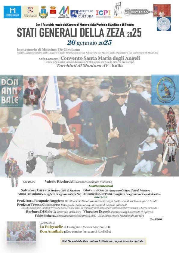 Domani l’apertura degli “Stati Generali della Zeza” a Montoro. L’evento è organizzato in memoria di Massimo De Girolamo, Medico, appassionato delle Cultura e delle Tradizioni locali, fondatore del Museo delle Maschere e del Carnevale di Montoro. La prima giornata si svolgerà presso la sala Convegni del Complesso di Santa Maria degli Angeli a Torchiati di Montoro con proiezioni audio-visivi e discussione della pratica e della ricerca sul campo. Questo il programma: 10,30 apertura dei lavori con Valerio Ricciardelli Direttore Scientifico MuMasCa; Salvatore Carratù Sindaco Città di Montoro; Giovanni Gaeta Assessore Cultura Città di Montoro; Anna Ansalone consigliera delegata Politiche Soc.; Antonello Cerrato consigliere delegato Provincia di Avellino. Gli interventi previsti: Prof. Dott. Pasquale Ruggiero Direttore Polo Didattico Universitario già professore di ruolo comparto AFAM; Prof.ssa Teresa Colamareo Paleografa Diplomatista Università di Napoli Federico II SGDZ, Conosciamo meglio il territorio dove ci muociamo, dove incontriamo persone per parlare, ballare, mangiare, bere e fare festa;