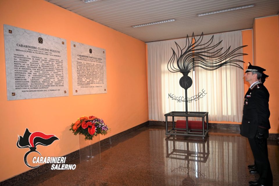 Nella mattinata odierna, presso il Comando Provinciale Carabinieri di Salerno si è svolta in forma solenne la prima parte della cerimonia, con prosieguo a Pontecagnano Faiano, di commemorazione dei Carabinieri Claudio PEZZUTO e Fortunato ARENA, Medaglie d’Oro al Valor Militare, alla memoria, brutalmente assassinati il 12 febbraio 1992, in piazza Giuseppe Garibaldi di Pontecagnano Faiano, nel corso di un conflitto a fuoco con due criminali. Nella circostanza, il Comandante Provinciale, Col. Filippo MELCHIORRE, ha deposto un omaggio floreale ai piedi delle lapidi marmoree poste all’ingresso della caserma intitolata alla memoria dei due Carabinieri caduti nell’adempimento del dovere.