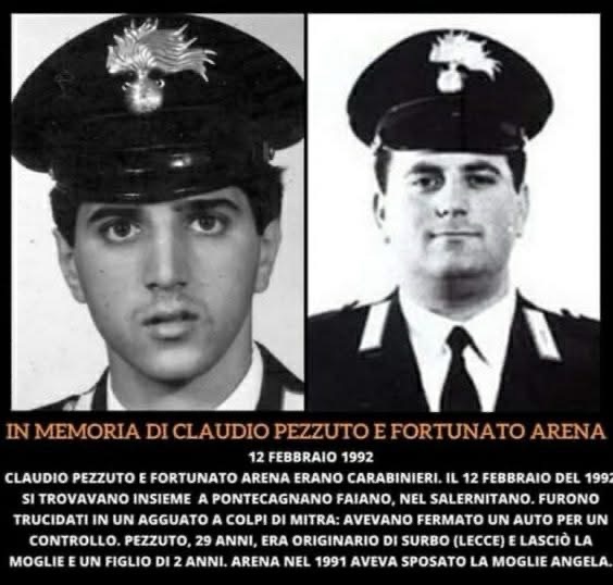 È la sera del 12 febbraio 1992 quando due Carabinieri di nemmeno 30 anni, Claudio Pezzuto e Fortunato Arena, stanno rientrando in caserma dopo una serie di controlli… ma passando per la piazza centrale, notano un fuoristrada fermo con a bordo alcune persone. Insospettiti, si fermano e chiedono i documenti al guidatore che consegna la patente, ma il passeggero, invece, di tutta risposta, apre il fuoco e lo stesso fa un terzo complice che sbuca da una cabina telefonica imbracciando una mitraglietta!!!