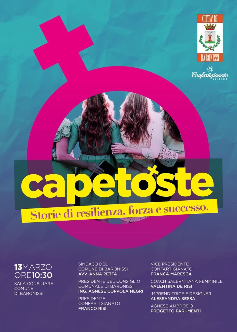 Si terrà giovedì 13 marzo 2025 alle ore 10:30, presso la Sala Consiliare del Comune di Baronissi, l’evento “Capetoste – Storie di resilienza, forza e successo”, un’iniziativa nata per dare voce ad esperienze di donne che, con determinazione e impegno, hanno saputo trasformare le difficoltà in opportunità, diventando esempi di leadership e innovazione. L’incontro, promosso dal Comune di Baronissi in collaborazione con Confartigianato Salerno, vedrà la partecipazione della Sindaca Avv. Anna Petta, della Presidente del Consiglio Comunale Ing. Agnese Coppola Negri e del Presidente di Confartigianato Franco Risi. A loro si uniranno figure di spicco dell’imprenditoria, dello sport e dell’associazionismo, tra cui Franca Maresca, Vicepresidente Confartigianato, Valentina De Risi, coach della Salernitana Femminile, Alessandra Sessa, imprenditrice e designer, e Agnese Ambrosio del progetto Pari-Menti. L’evento sarà un’occasione per confrontarsi sulle pari opportunità di genere e sul ruolo delle donne nella società e nel mondo del lavoro, con un’attenzione particolare al tema dell’imprenditoria femminile, ancora oggi caratterizzata da ostacoli strutturali e culturali.