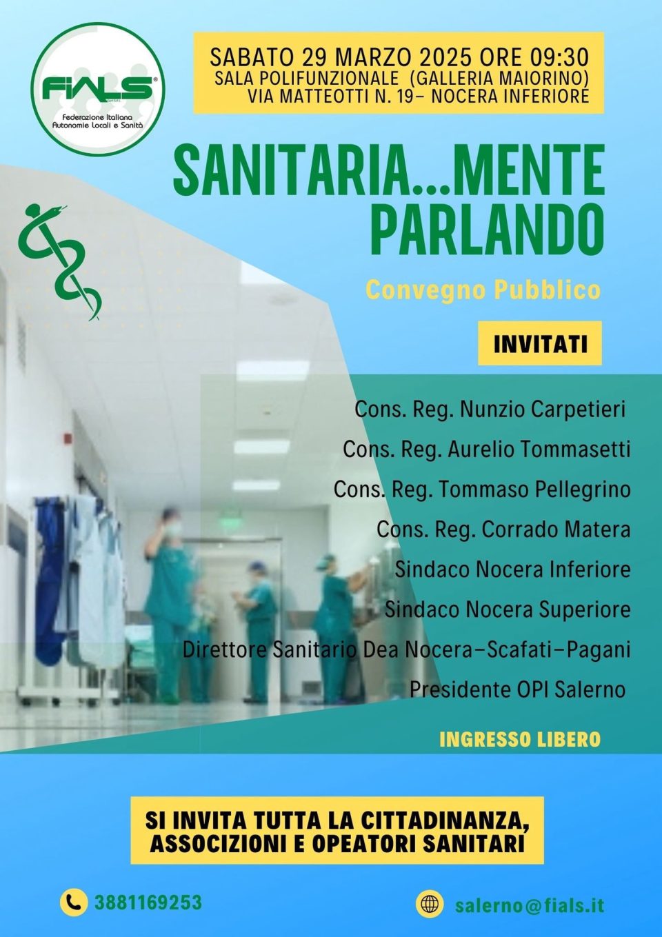Sabato prossimo alle 9,30, presso la Galleria Maiorino di Nocera Inferiore si terrà il convegno pubblico “Sanitaria…Mente Parlando”, un momento di confronto sul futuro della sanità locale e sulle prospettive per operatori e cittadini. All’evento sono stati invitate figure istituzionali di rilievo, tra cui i consiglieri regionali Nunzio Carpentieri, Aurelio Tommasetti, Tommaso Pellegrino e Corrado Matera. Presenti anche i sindaci di Nocera Inferiore e Nocera Superiore, il direttore sanitario del Dea Nocera-Scafati-Pagani e il presidente dell’Ordine delle professioni infermieristiche (Opi) di Salerno.