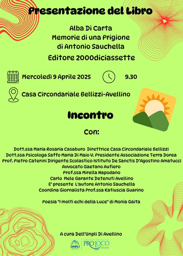 Domani alle ore 9:30, presso la Casa Circondariale di Bellizzi di Avellino si terrà la presentazione del libro “Alba di Carta. Memorie di una Prigione” di Antonio Sauchella, edito da 2000diciassette. L’evento, organizzato dall’UNPLI di Avellino, rappresenta un importante momento di riflessione sui temi della detenzione, della memoria e della rinascita attraverso la scrittura. Alla presentazione parteciperanno numerosi ospiti istituzionali e del mondo accademico, tra cui la direttrice della Casa Circondariale di Bellizzi, Dott.ssa Maria Rosaria Casaburo, e la psicologa Dott.ssa Saffo Maria Di Maio, vicepresidente dell’Associazione Terra Dorea. Interverranno inoltre il Prof. Pietro Caterini, dirigente scolastico dell’Istituto De Sanctis D’Agostino Amatucci, l’avvocato Gaetano Aufiero, la Prof.ssa Mirella Napodano e Carlo Mele, Garante dei detenuti di Avellino. Coordinerà l’incontro la giornalista Katiuscia Guarino. L’autore Antonio Sauchella sarà presente all’evento per raccontare la sua esperienza e il significato profondo della sua opera. A impreziosire la mattinata, anche la lettura della poesia “I molti echi della luce” di Monia Gaita. Un’iniziativa che sottolinea il valore della cultura come strumento di crescita personale e collettiva, anche nei luoghi più difficili.