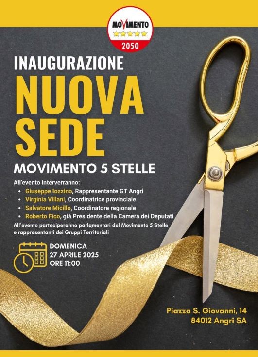Domenica 27 aprile, alle ore 11:00, si terrà l’inaugurazione del nuovo Spazio 5 Stelle in Piazza S. Giovanni 14, ad Angri. Un evento che vedrà la partecipazione di importanti esponenti del Movimento 5 Stelle, tra cui l’ex Presidente della Camera dei deputati, Roberto Fico, insieme a Virginia Villani, Coordinatrice provinciale del Movimento e Salvatore Micillo, Coordinatore regionale.
