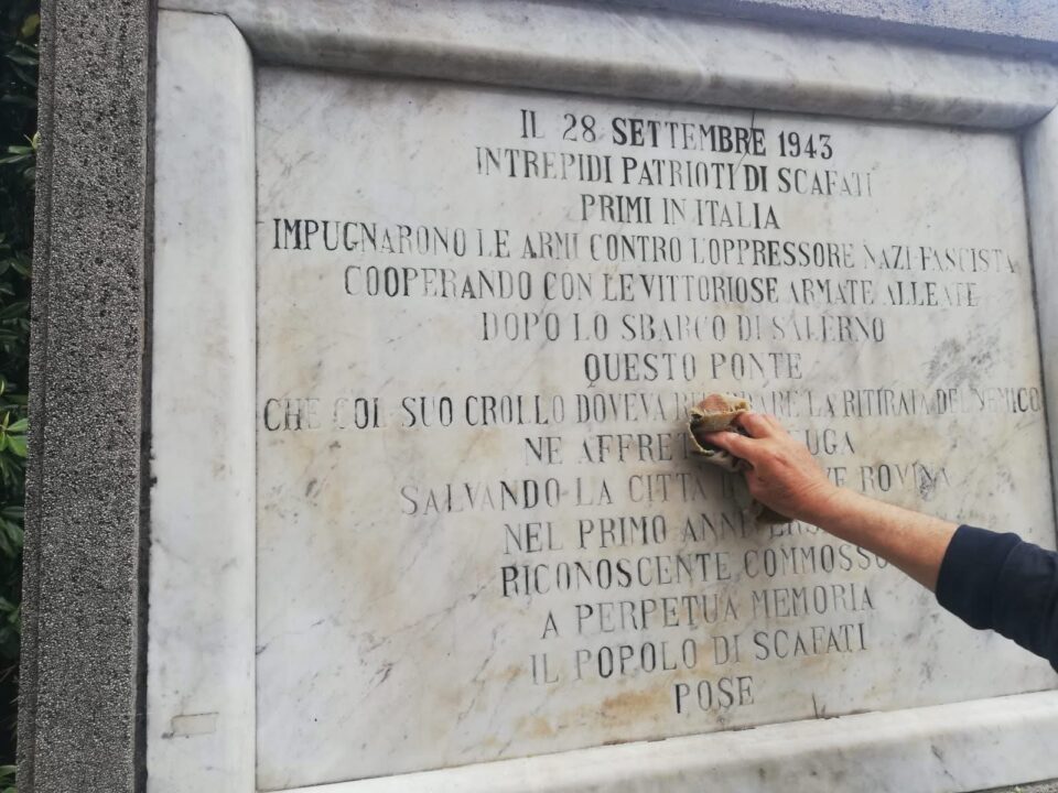 Dopo le diverse segnalazioni giunte attraverso i social, il sindaco di Scafati Pasquale Aliberti ha provveduto a far ripulire la lapide che si trova sul ponte del Fiume Sarno, di fronte Piazza V.Veneto, apposta in ricordo della liberazione della Città di Scafati, Croce al valor militare e Medaglia d’oro alla Resistenza. La lapide qualche tempo fa fu deturpata con una scritta nera che riportava la dicitura “VAR 05”.