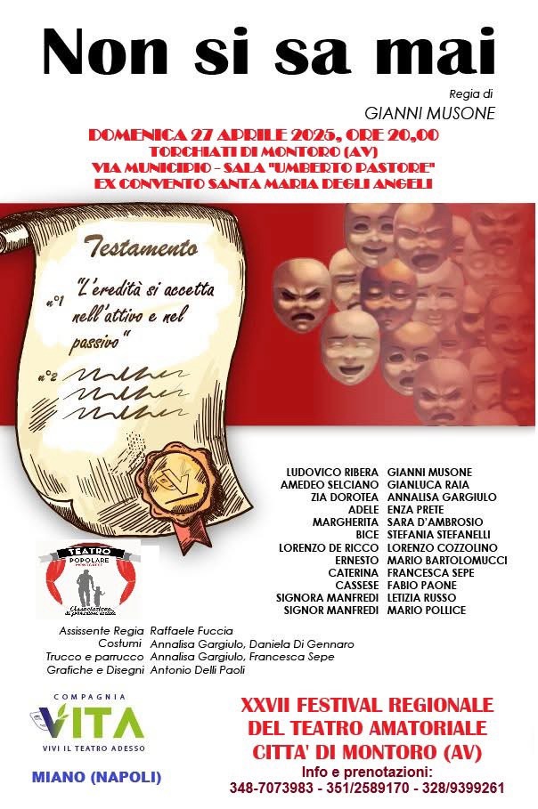 Riprende stasera  dal complesso monumentale di Santa Maria degli Angeli a Torchiati  la XXVII edizione del “Festival Regionale del Teatro Amatoriale Città di Montoro” organizzato dall’ “Associazione Teatro Popolare Montorese”. In attesa di rientrare nella sede del Centro Sociale Sindacale e dopo aver lasciato quella utilizzata negli ultimi anni sita alla frazione Preturo, causa trasformazione in casa della salute, in accordo con il Comune è stata individuata la sala “Umberto Pastore” per concludere questa XXVII edizione del “Festival Regionale del Teatro Amatoriale Città di Montoro”. Stasera alle ore 20,00 sarà in scena la Compagnia teatrale “VITA, VIVI  IL TEATRO ADESSO”  di MIANO di NAPOLI  che rappresenterà la commedia in due atti: “ NON SI SA MAI ” con la regia di Giovanni Musone.